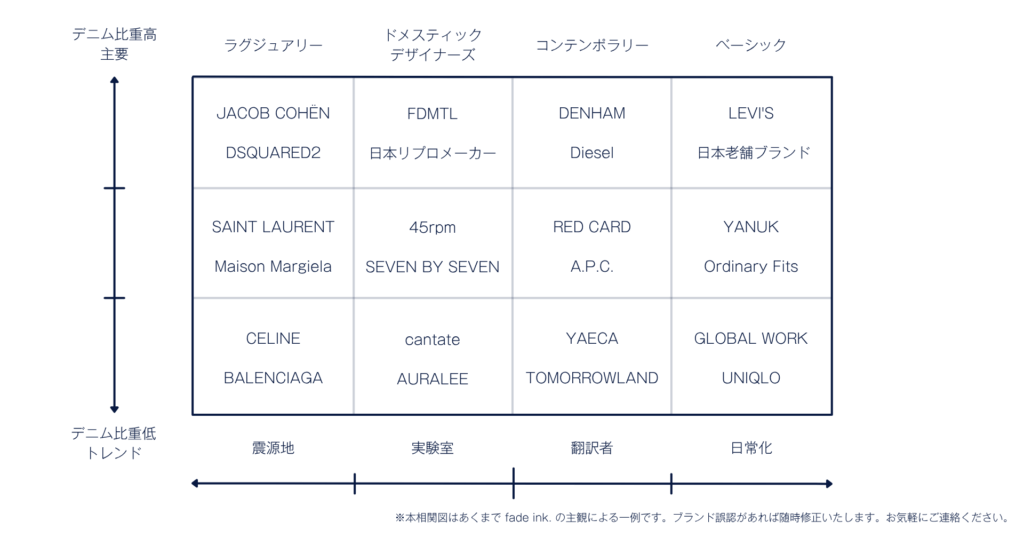 もしかしたらこの2軸から、ブランドがデニムでどんな体験を提供しようとしているか、見えてくるんじゃないか?そう仮説を立ててみました。