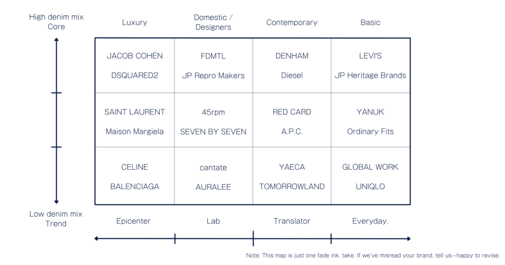 First the vertical axis, ① denim share—simply, how prominently denim sits in the brand’s mix.